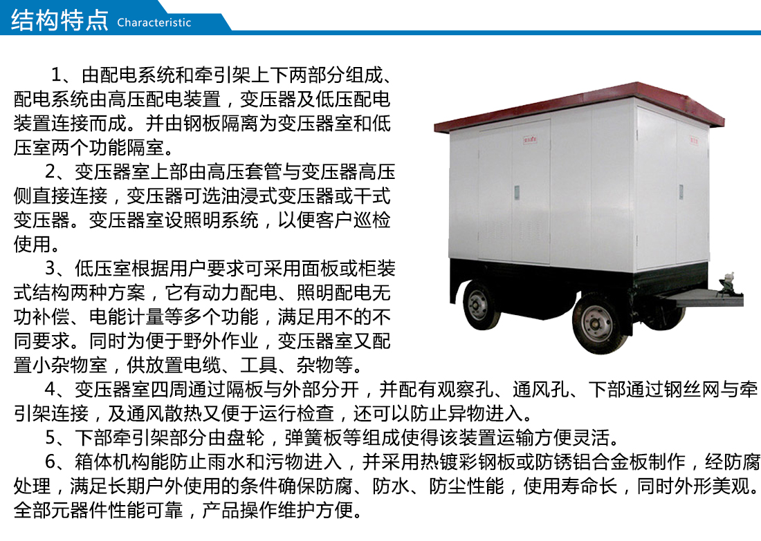 移動式箱式變電站適用于住宅小區(qū)、城市公用變、繁華鬧市、施工電源等,用戶可根據(jù)不同的使用條件、負荷等級選擇箱式變。